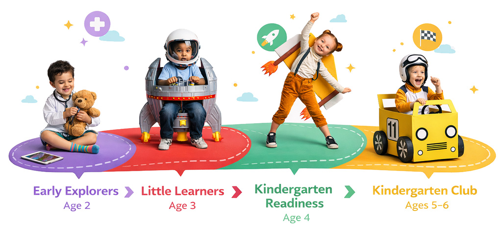 Children begin on the path designed for their age and stage, then naturally level up as they grow. Each stage builds on the last, strengthening skills and confidence every step of the way.